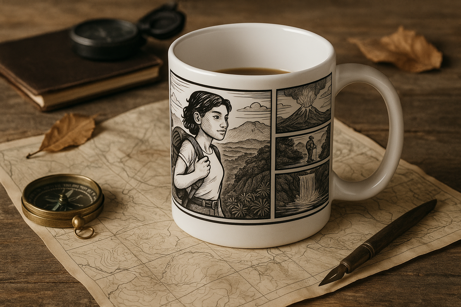 Inspiré des récits d’exploration, ce visuel met en scène une jeune aventurière au cœur d’une nature sauvage : un volcan en éruption, une jungle dense, un sentier mystérieux et une cascade majestueuse. Chaque illustration est finement détaillée dans un style gravure moderne, mêlant noir, blanc et touches de couleur pour une atmosphère à la fois rétro et dynamique.
