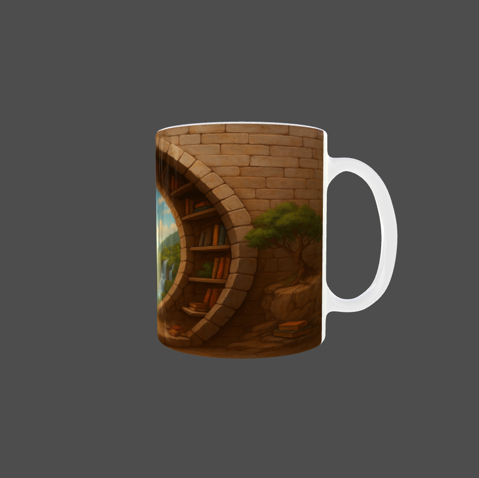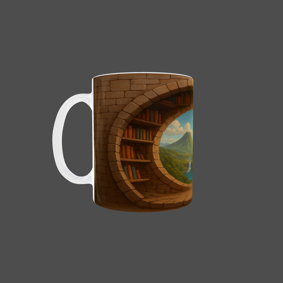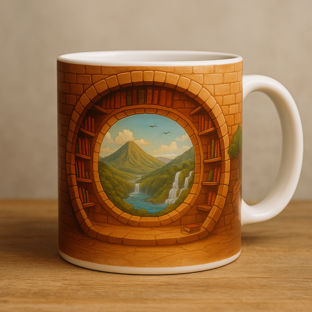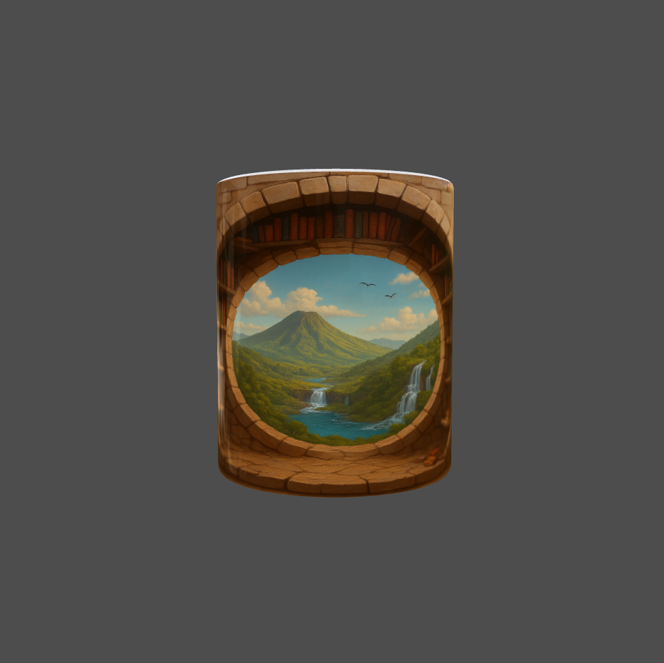 Plongez dans un univers magique chaque matin avec notre mug illustré “Fenêtre sur l’Évasion”. Ce design enchanteur vous transporte au cœur d’un paysage tropical luxuriant, où une majestueuse montagne surplombe des cascades cristallines et une rivière sinueuse. La scène est encadrée par une bibliothèque circulaire, suggérant un passage entre monde réel et imaginaire — une invitation au rêve et à la découverte.