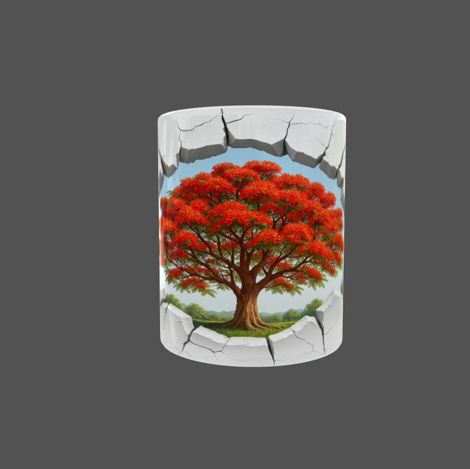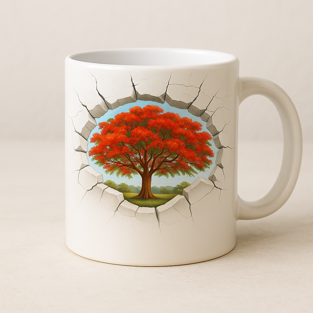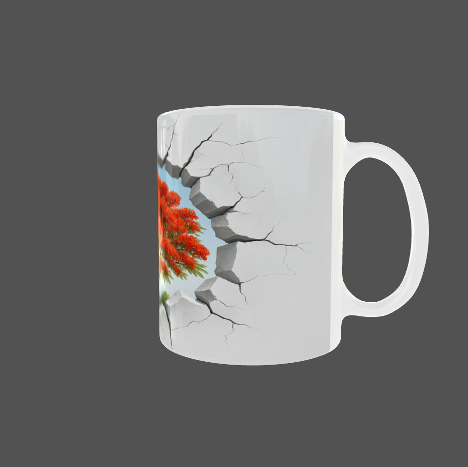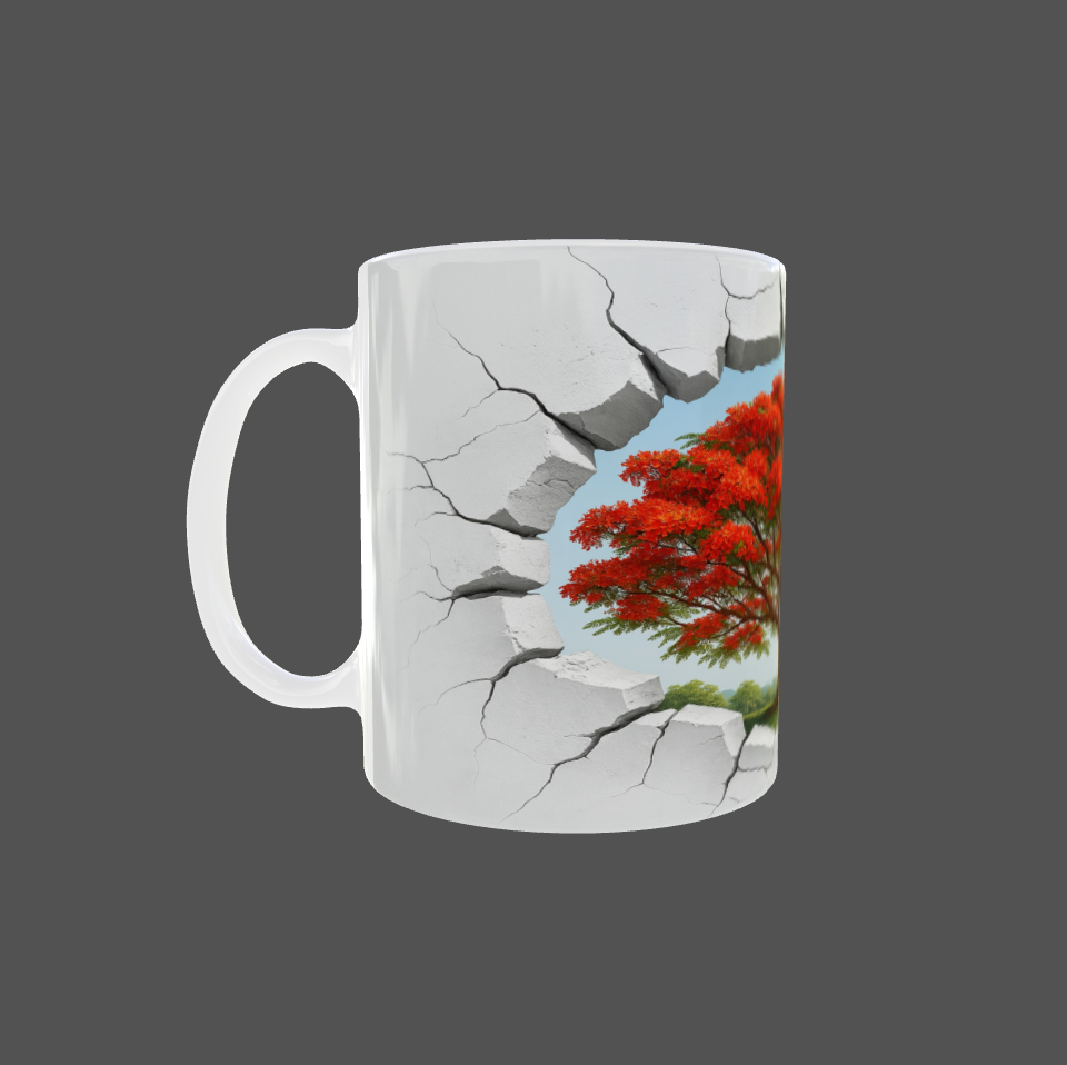 Apportez une touche d'originalité et de nature à vos pauses café avec notre mug exclusif au design "Mur Cassé & Flamboyant". Ce visuel unique représente un effet 3D réaliste de mur fissuré, révélant en son centre un somptueux Flamboyant en fleurs, symbole de beauté tropicale et de vitalité. L'illusion de profondeur et de brèche donne un effet spectaculaire, comme si l’arbre majestueux surgissait de la tasse.