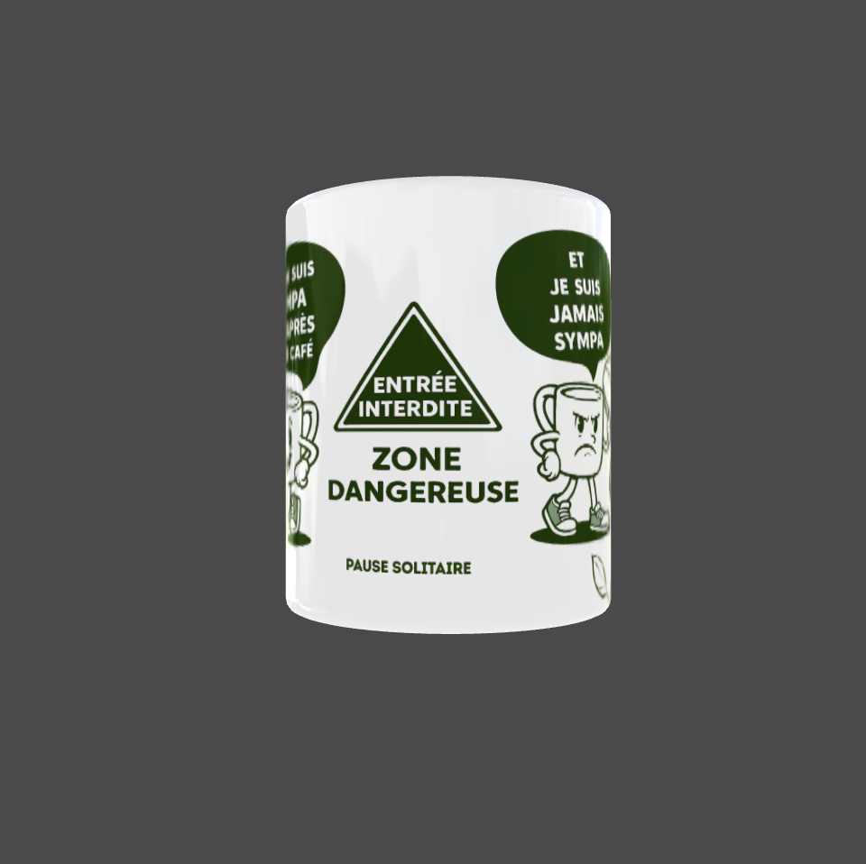 Son design original met en scène deux tasses aux personnalités bien marquées : l’une joyeuse qui n’est sympa qu’après son café, et l’autre toujours grincheuse. Le message "Entrée interdite – Zone dangereuse" illustre parfaitement l’importance du café pour commencer la journée du bon pied.