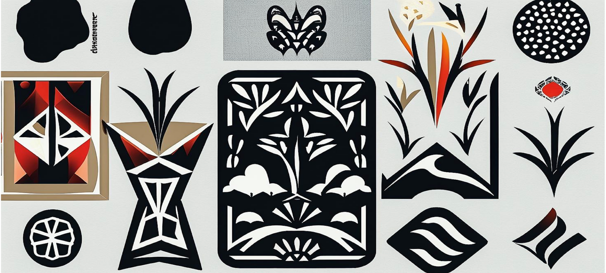 - Motifs graphiques noirs inspirés de la nature et des formes géométriques